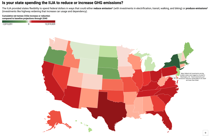 While California spends some of the federal money – and a lot of its own money – on climate-supportive projects, reductions from those won’t be enough to make up the difference. T4America estimates that the increase in emissions over time will be almost twice as much as any reductions resulting from federal investments.