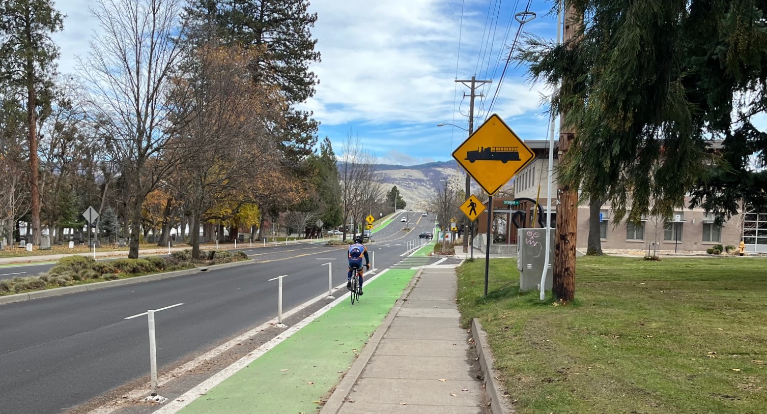 Lastly there’s Ashland Street, connecting to the Southern Oregon University campus. The Ashland Street bikeway features bright green pavement bike lanes protected by soft-hit posts.