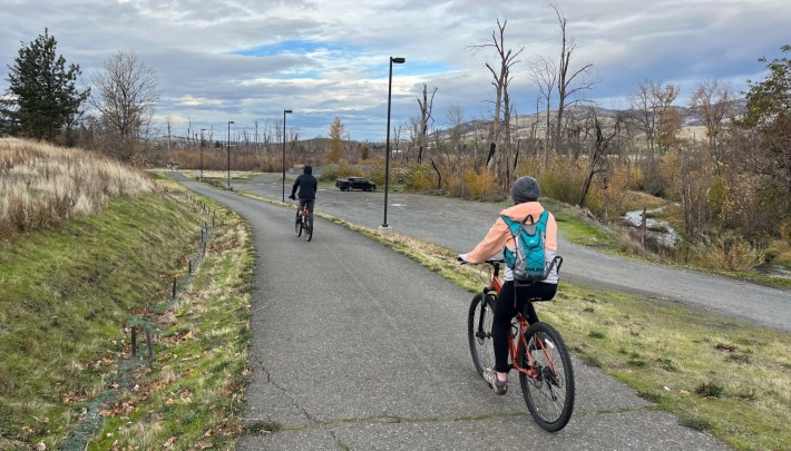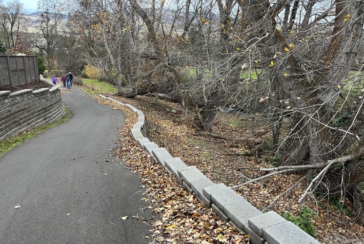 The Bear Creek path ends in Ashland, where (after a short gap) cyclists can continue southeast on the nearly 2.5-mile long Railroad District bike path. It’s a fairly basic bike/walk path, with quite a few at-grade crossings and access to several parks and neighborhoods. One stretch goes through a cemetery.
