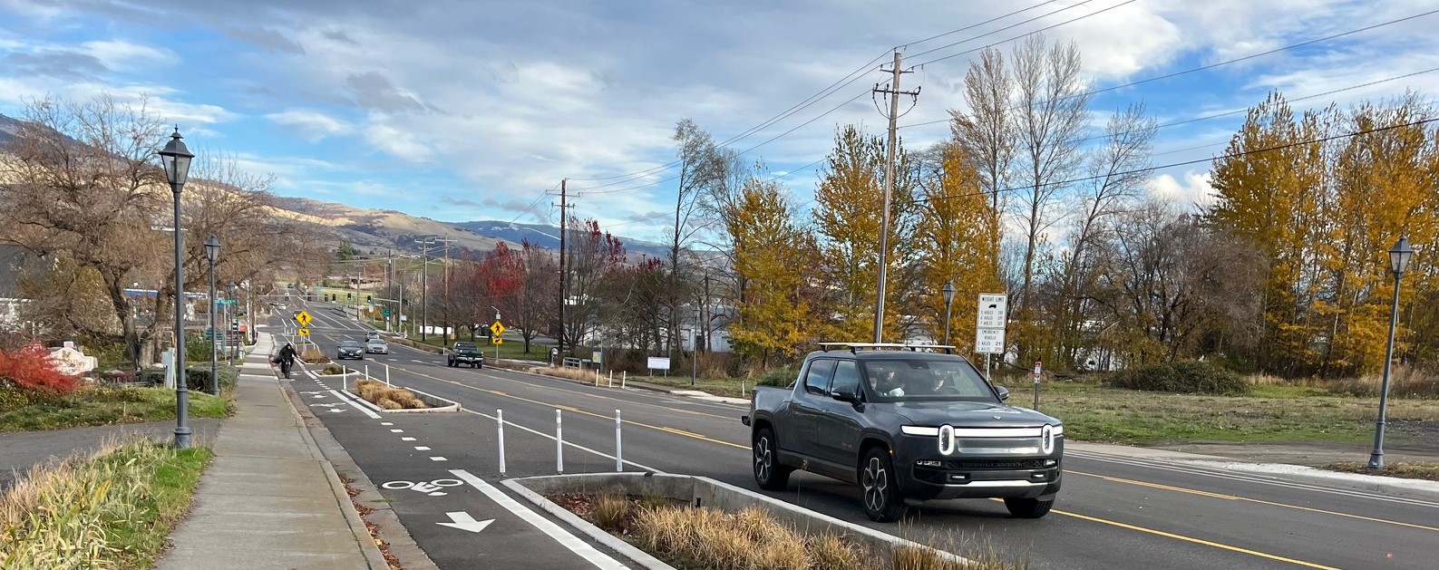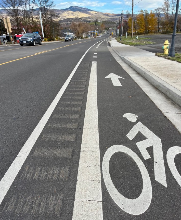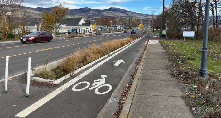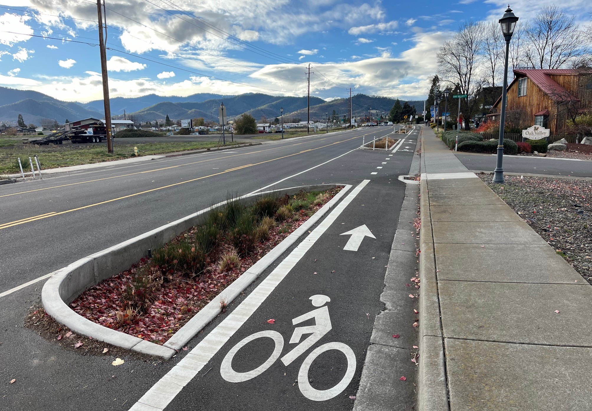 In 2022, Talent completed fairly ambitious curb-protected bike lanes on West Valley View Road. The project includes landscaped islands that cleanse and infiltrate rainwater, contributing to the health of adjacent Wagner Creek.
