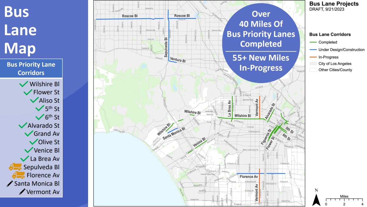 Metro has been busy collaborating with underlying cities (mainly Los Angeles City, tapping the expertise of the Transportation Department LADOT) to add 49.9 lane-miles of new bus lanes in the past five years. Metro says it has dozens of additional bus lane miles in progress.