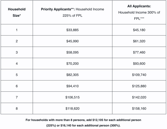 First, potential applicants can check their eligibility for the program by making sure they are California residents and that their total family income is lower than three times the Federal Poverty Level (below).