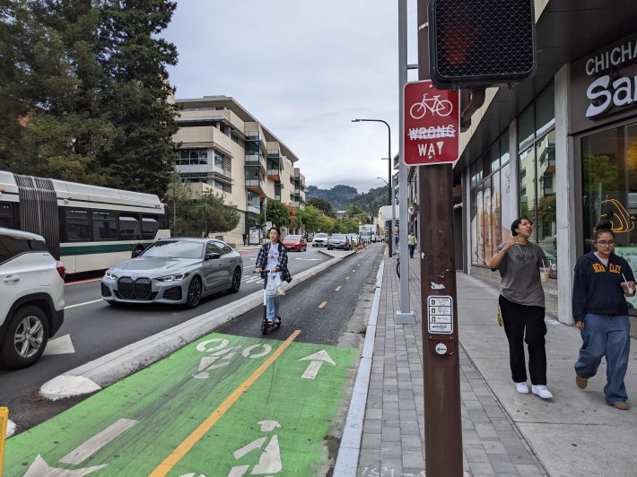Disability advocates, meanwhile, came to the event to celebrate, but also to make sure the city does better at addressing their needs. “I applaud the effort,” said Helen Walsh, an advocate who has low vision and rides a three-wheel adaptive bike. “But people are having trouble with the two-way bike lane,” she said, given the width of adaptive bikes. Michaela Tsztoo, who is visually impaired, stressed the importance of maintaining sidewalks and streets so cracks don’t cause people to fall. “Our canes get stuck in broken streets,” she said, adding that the general condition of Berkeley’s pavement is problematic. “The city of Berkeley needs to improve accessibility.”