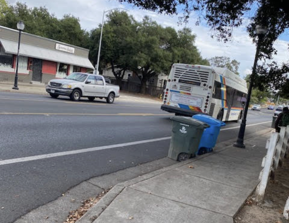 Leaving Oakmont, the bus crossed the highway and entered into a loop to Los Guilicos Village, an interim housing site that was established during the pandemic when a large encampment of unhoused people was cleared from the Joe Rodota Trail on the other side of Santa Rosa. The passenger with the four bags of groceries got off the bus at Los Guilicos, along with several other bus riders.