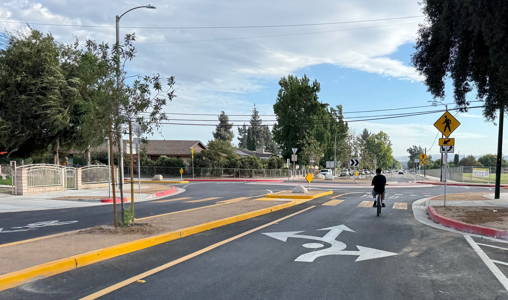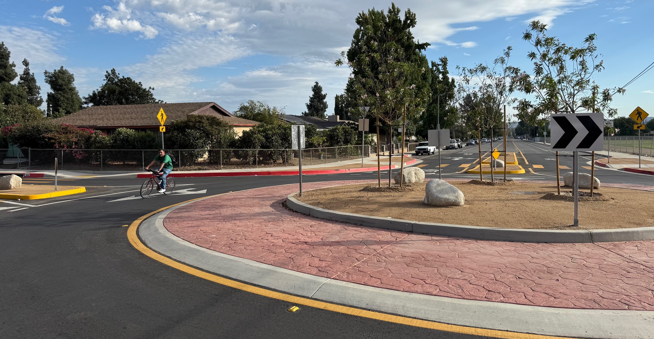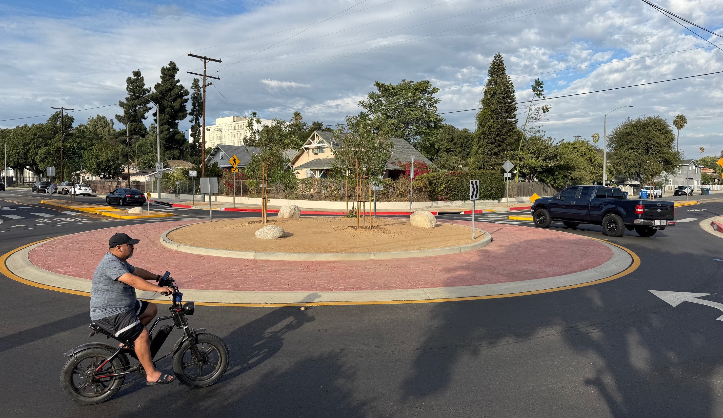 These are not quick-build mini-roundabouts, but full-on with concrete curbs, and landscaping consisting of trees and boulders. These are impressive substantial roadway features that really do force drivers to pay attention, or risk damage to their car or even their person.