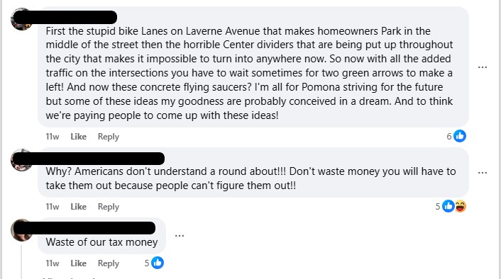 Pomona is still wrapping up construction, and the new roundabouts already have their critics. One Facebook commenter termed them “concrete flying saucers.”