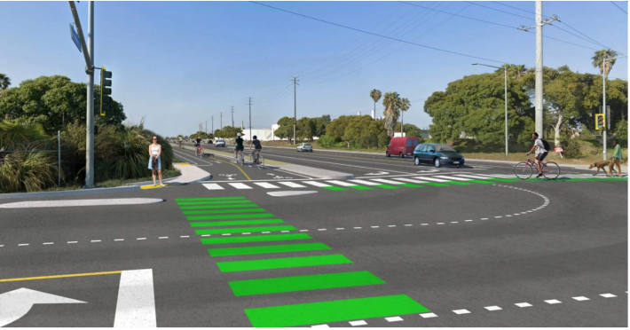 But it’s the street-level vision that makes it transformative. Along Loynes Drive, the existing bike lanes will evolve into Class IV protected bikeways, buffered by physical barriers rather than paint. North of 2nd Street, a new bi-directional Class I shared path will let cyclists and pedestrians move comfortably away from traffic. Bollard lighting will illuminate the route while minimizing light pollution near protected wetlands—proof that safety and sustainability can coexist.