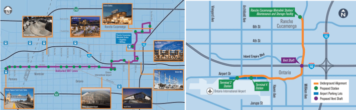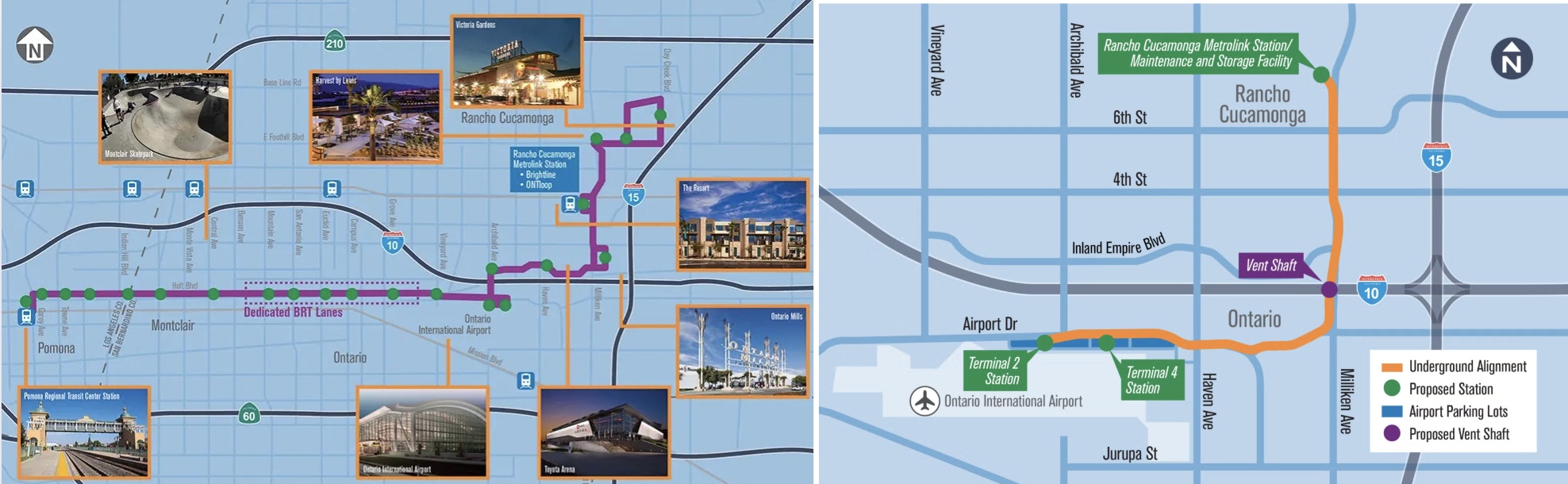 The ONT Connector project is/was first proposed by Elon Musk in 2019 to connect Rancho Cucamonga Metrolink/Future Brightline West Station and ONT Airport via a tunnel for autonomous underground vehicles.