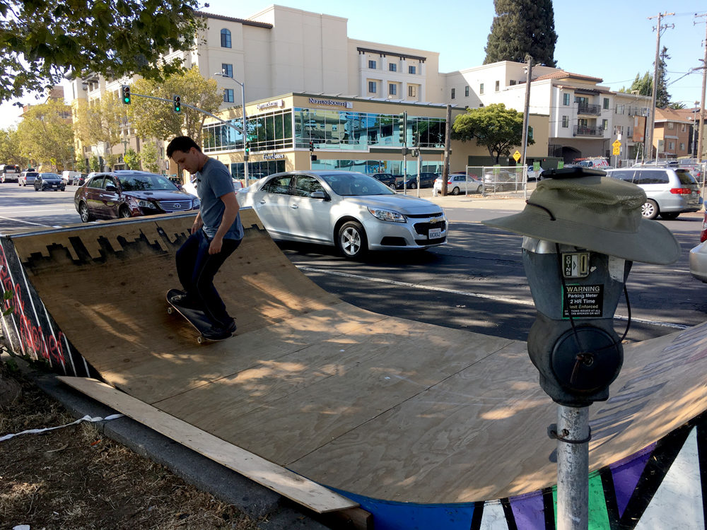 Bonzing skateboards set up a ramp for play at Lake Merritt in Oakland. Also, the parking meter did double duty as a hat/phone holder. Photo: Melanie Curry/Streetsblog