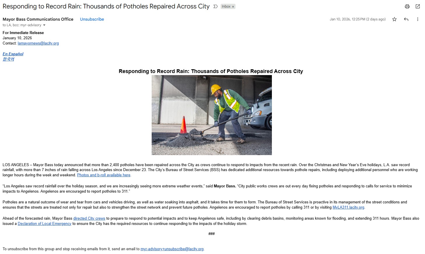- L.A. City Has Repaired 2,400 Potholes Lately (Daily News, Mayor Bass press release)