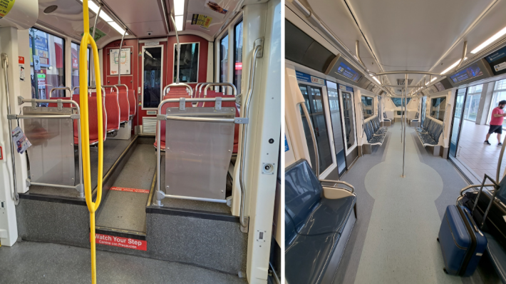Sections of Trolley cars (above, left) have interior steps and narrow aisles that block out travellers with wheelchairs and luggage. By contrast, people mover trains (above, right) have wide aisles and zero interior steps, making their entire interiors wheelchair-accessible.