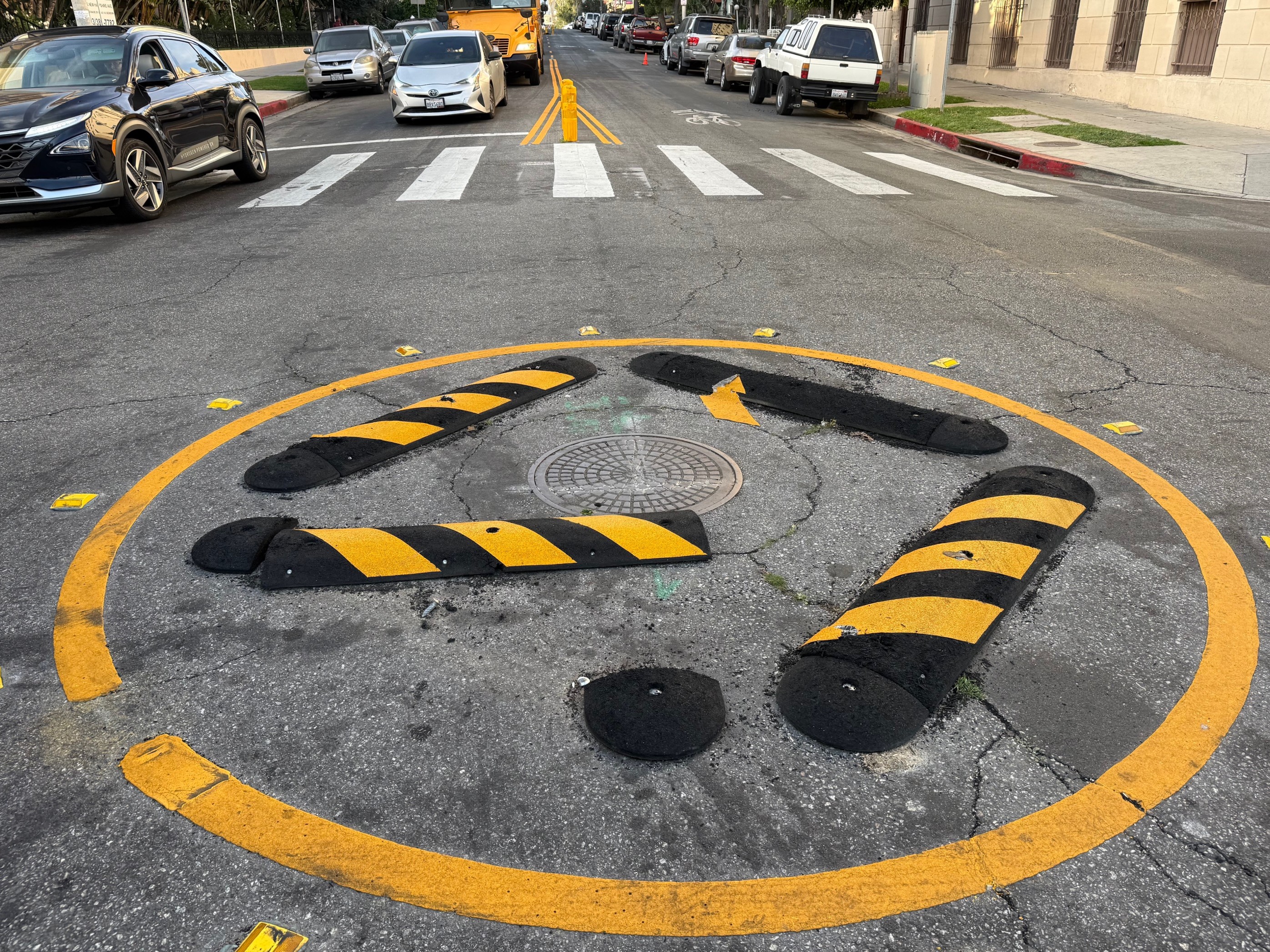 Last year, after a driver killed a 9-year-old, and after volunteers painted guerilla crosswalks, the city of Los Angeles Transportation Department (LADOT) installed official crosswalks and a temporary traffic circle there.