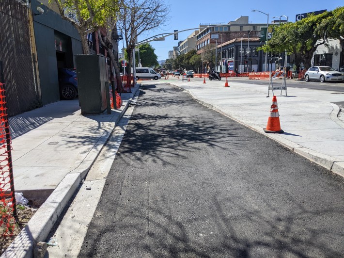 The new two-way protected bikeway (upgraded from one way) is taking shape. There will be landscaped medians separating the bikeway from traffic (at least in places), bulb-outs, benches, bike racks, and transit boarding islands.