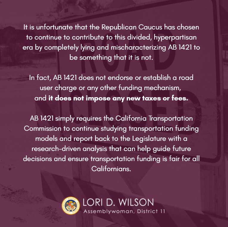 Assembly Bill 1421, Vehicles: Road Usage Charge Technical Advisory Committee, directs the California Transportation Commission to continue and deepen a study into whether a road usage charge could eventually serve as an alternative to the state’s traditional gas tax. Passed the Assembly and was assigned to the Rules Committee in the Senate.